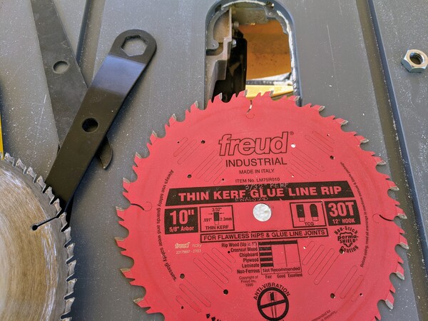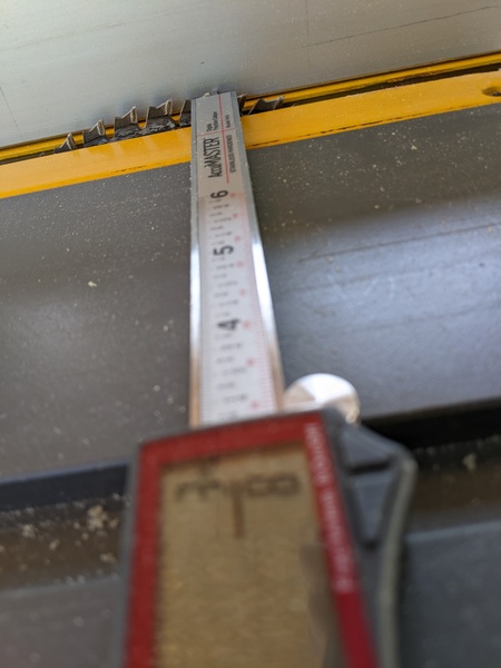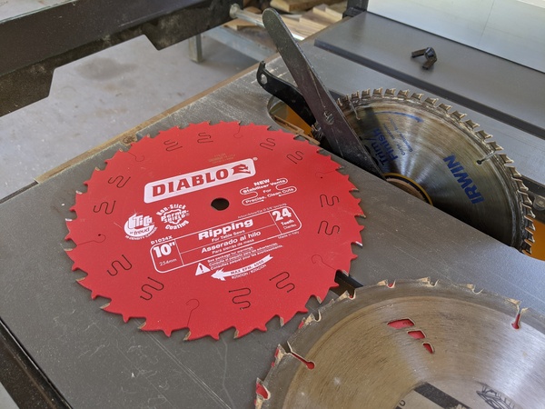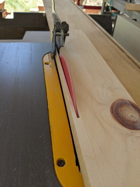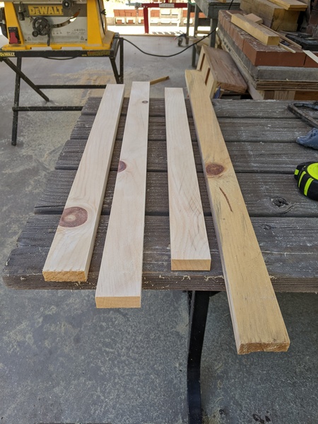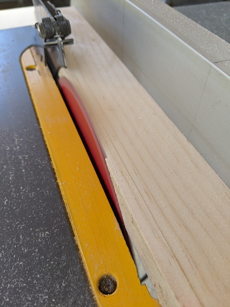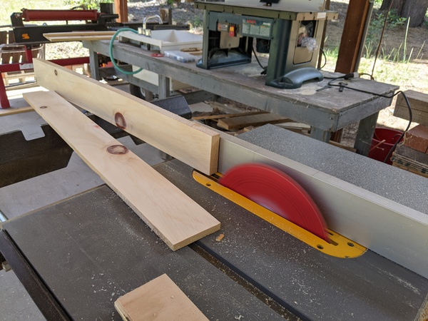 The boards were also differing widths, so with the ripping blade still in the saw, I cut them all to the same width. This step also makes the long edges straight and parallel.