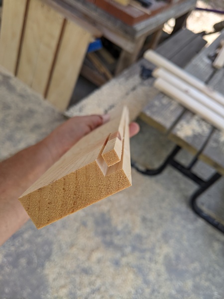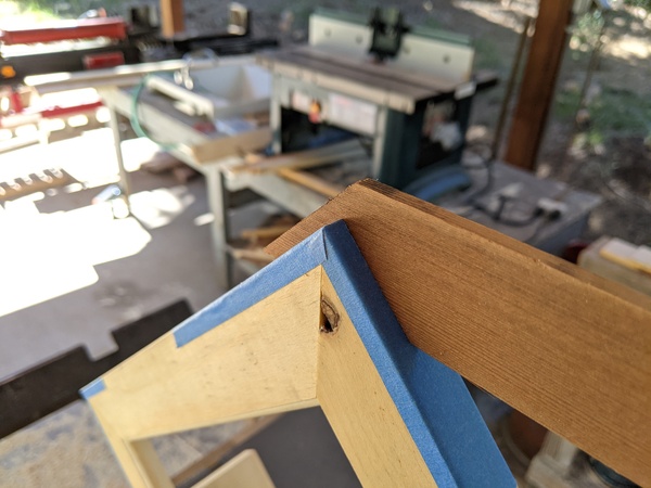 The splines were made from Redwood, which gives a nice contrasting color and still strengthens the frame. The splines were glued into place. Once dry, the excess spline material was removed using a hand plane.