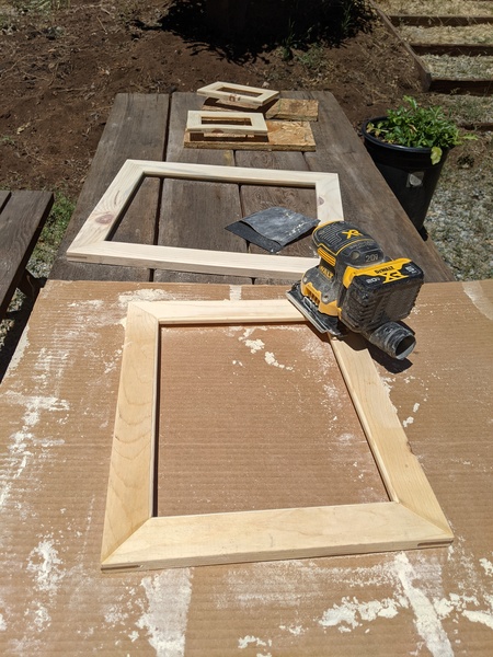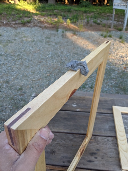 The frames were then sanded with 100 grit and then 220 grit sandpaper. Two coats of shellac were then applied, sanding the high spots down with steel wool after each coat of shellac.